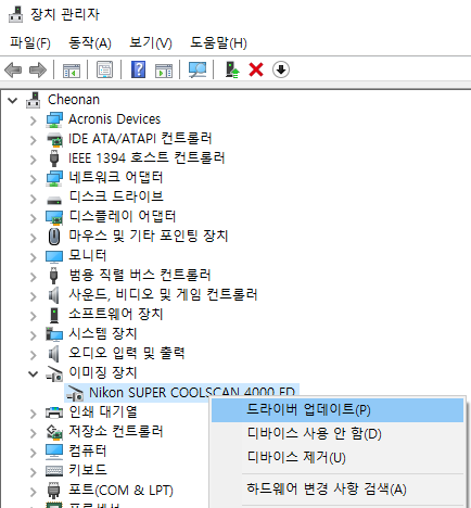 장치관리자 – 이미징 장치 – Nikon Cool Scan 4000ED를 찾아 간 후 우클릭 해 드라이버 업데이트를 클릭한다. (그림 2, 3)