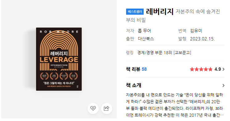 내가 알고 있었던 좁은 의미의 레버리지는 대출을 일으켜 큰 금액의 자산을 구매하고, 해당 자산의 가치가 상승하면 이를 매도해 시세차익을 얻어 투자금 대비 수익률을 크게 가져가는 방법이었다. 하지만 책에서 이야기하는 레버리지는 이런 좁은 의미의 레버리지를 말하는 것이 아니었다.